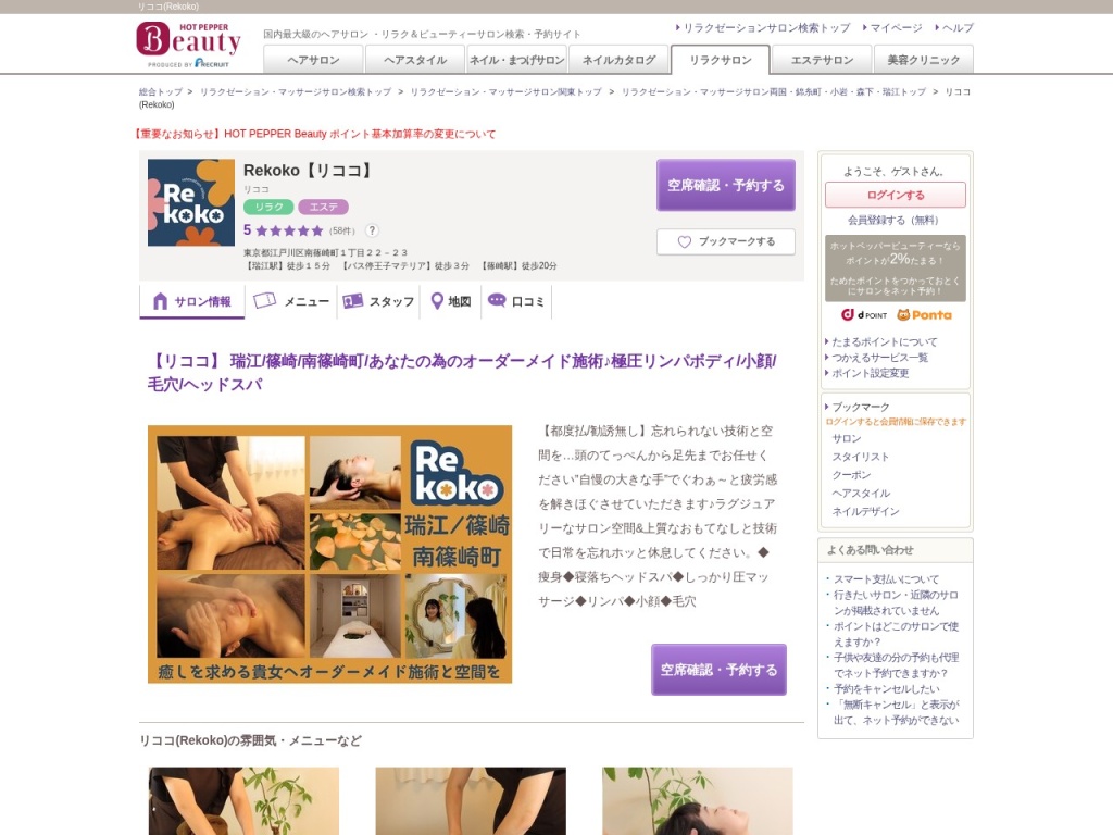 江戸川区内では、Rekoko 【リココ】(〒133-0065 東京都江戸川区南篠崎町1丁目22−23)のように、経験豊富な施術者が在籍し、技術力の高さで評判のサロンがあります。特に身体の痛みや不調を改善したい場合は、国家資格保持者がいるサロンを選ぶことで、より専門的なケアを受けられる可能性が高まります